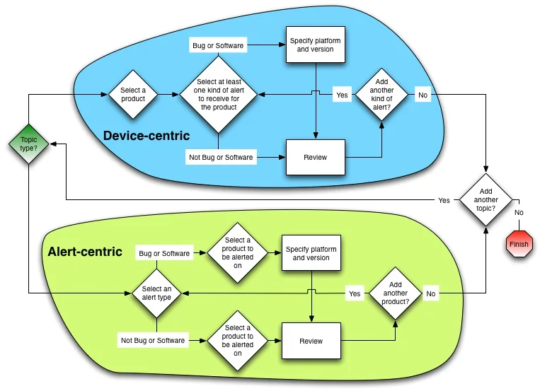 The implemented flow shown below mitigates the potential complexity of pairing devices and alerts by giving users a simple choice of how to start: with a device or a type of alert. Each topic selected is then paired with one more sub-topics of the opposite kind. Thus, a chosen device is paired with alert types, or a chosen alert type is paired with devices. Regardless of the topic combinations chosen, users can populate a single email with as many topics as they desire. The subscription tool build with this flow became one of the most important on Cisco.com's Support site.
